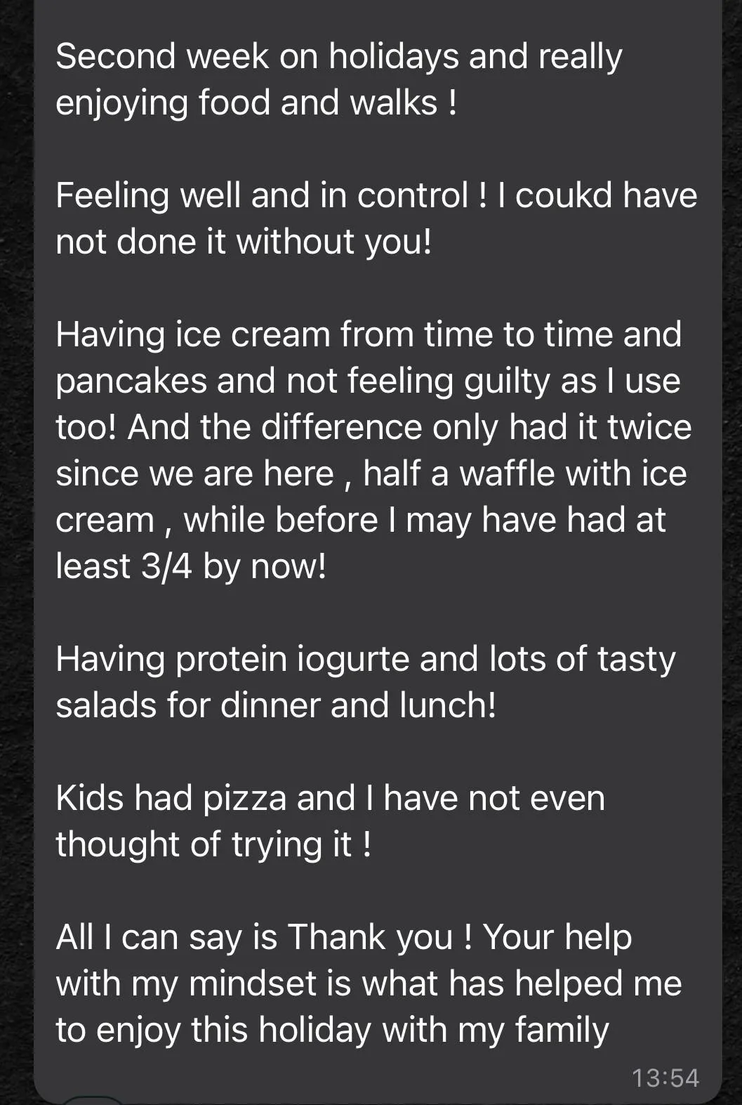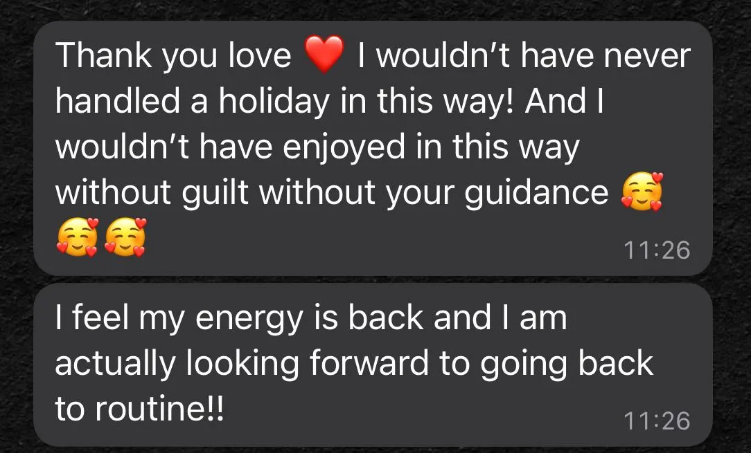 You want to be able to go on holiday and not experience food guilt or stress about going on a diet when coming back.